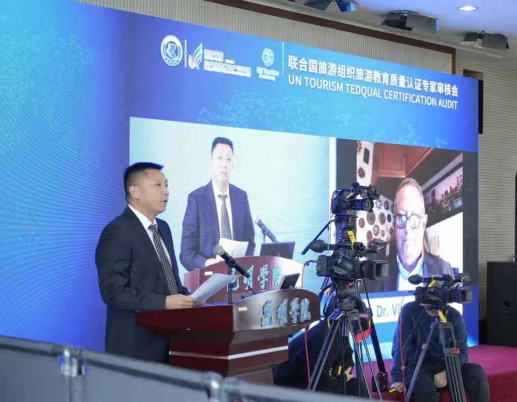 学校党委委员、副校长夏体渊致答谢辞,代表学校全体师生,向认证专家维克多·查莱博士致以诚挚感谢。他表示,昆明学院将以此次审核为新起点,认真梳理专家反馈意见,逐项落实整改提升,持续优化人才培养模式,努力培养更多符合全球旅游产业发展需求的高素质应用型人才。同时,诚挚邀请查莱博士有机会能来昆明学院实地考察指导,也希望未来能与联合国世界旅游组织及各位专家保持密切交流,共同为推动旅游教育的国际化、专业化发展贡献力量!